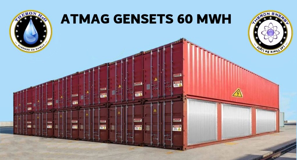 This single Theron ATMAG GENSETS® 60 Mega Watt or 60,000kW or 80,461 mechanical horsepower Permanent Industrial Silent AI Data Center Magnetic Energy Generator, including Atmospheric Water Generators 48,000 Liters/Day with Reverse Osmosis filters, is ideal for large industrial Data Center and AI Artificial Intelligence applications. These generators run quietly and have zero emissions because they are perpetual energy generators and do not require a fuel source or energy source to operate.  Installation is easy because you do not need to connect to a diesel or propane tank and once you have connected the harness to your electrical distribution point, you can turn off your utility company supply for good.